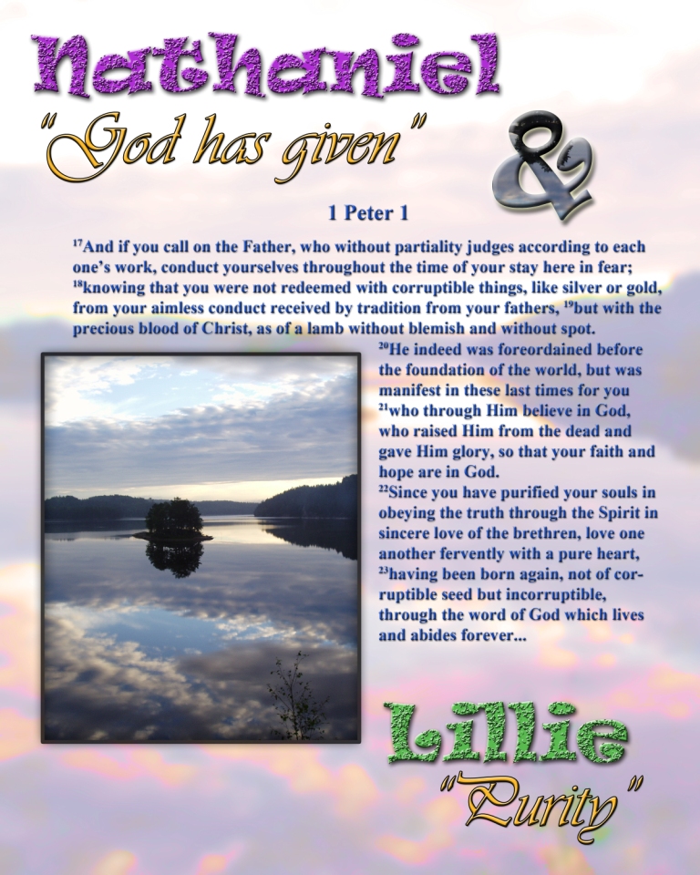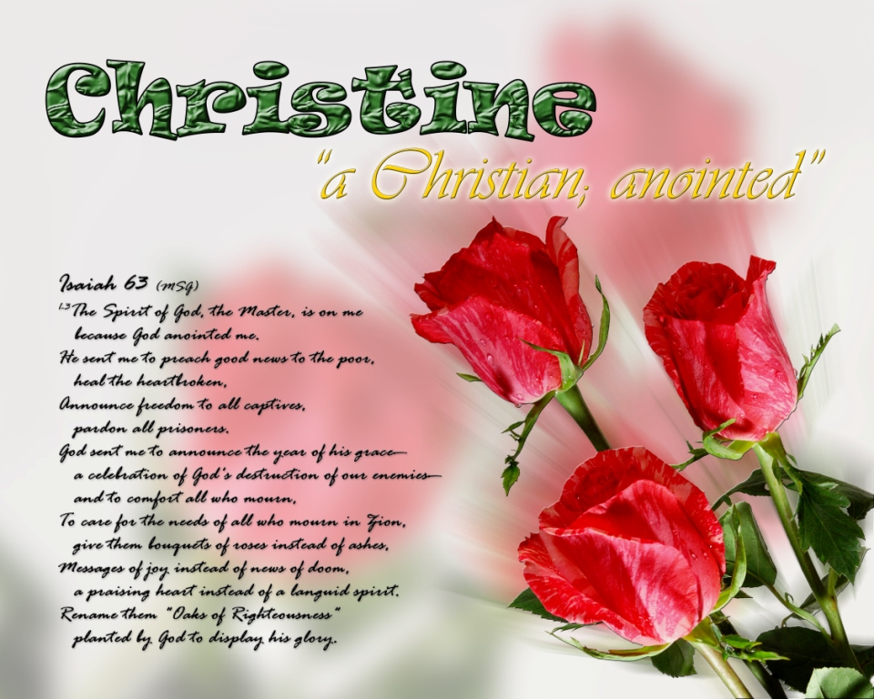 Not much to say here other than that I LOVE Photoshop and I love playing with it. I’ve been messing with it since 2003, but only in the last couple of years have I begun doing any kind of “art” with it. Here are some examples of my stuff that I haven’t posted on my blog pages. I do the names as people have asked me to make them and look up scripture and some kind of picture or graphic to go with them. Please contact me if you would like one done for you. The prices for these will be the same as the ones listed for my other graphics. Pricing and order information is listed to the right. Please allow 2-4 weeks for delivery. Thanks ahead of time for your support!!